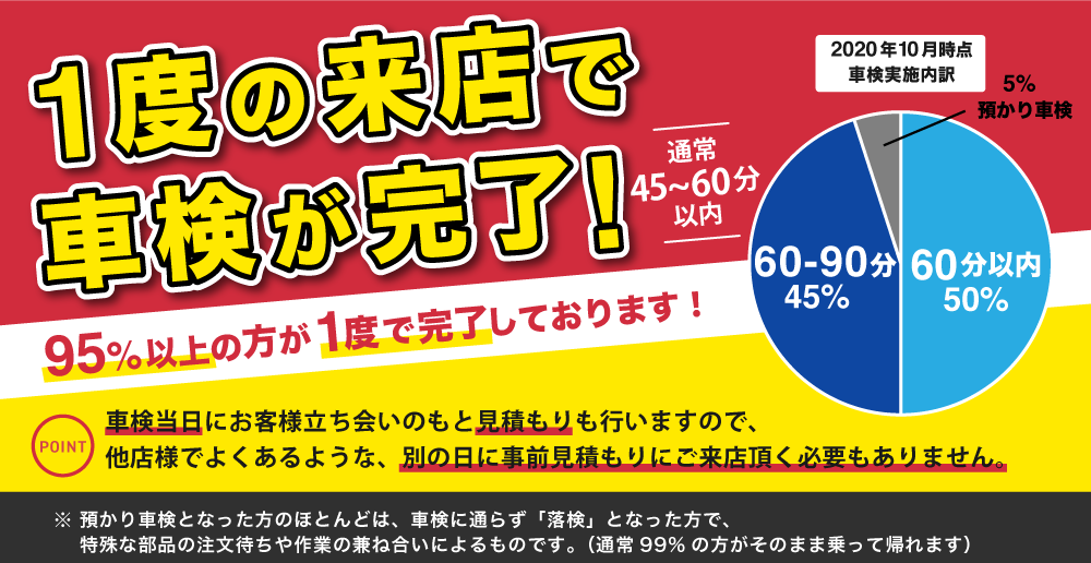 マッハ車検諏訪本店の車検は基本的に45〜90分程度で終了致しますので、お待ち頂いてそのまま乗って帰って頂けます。